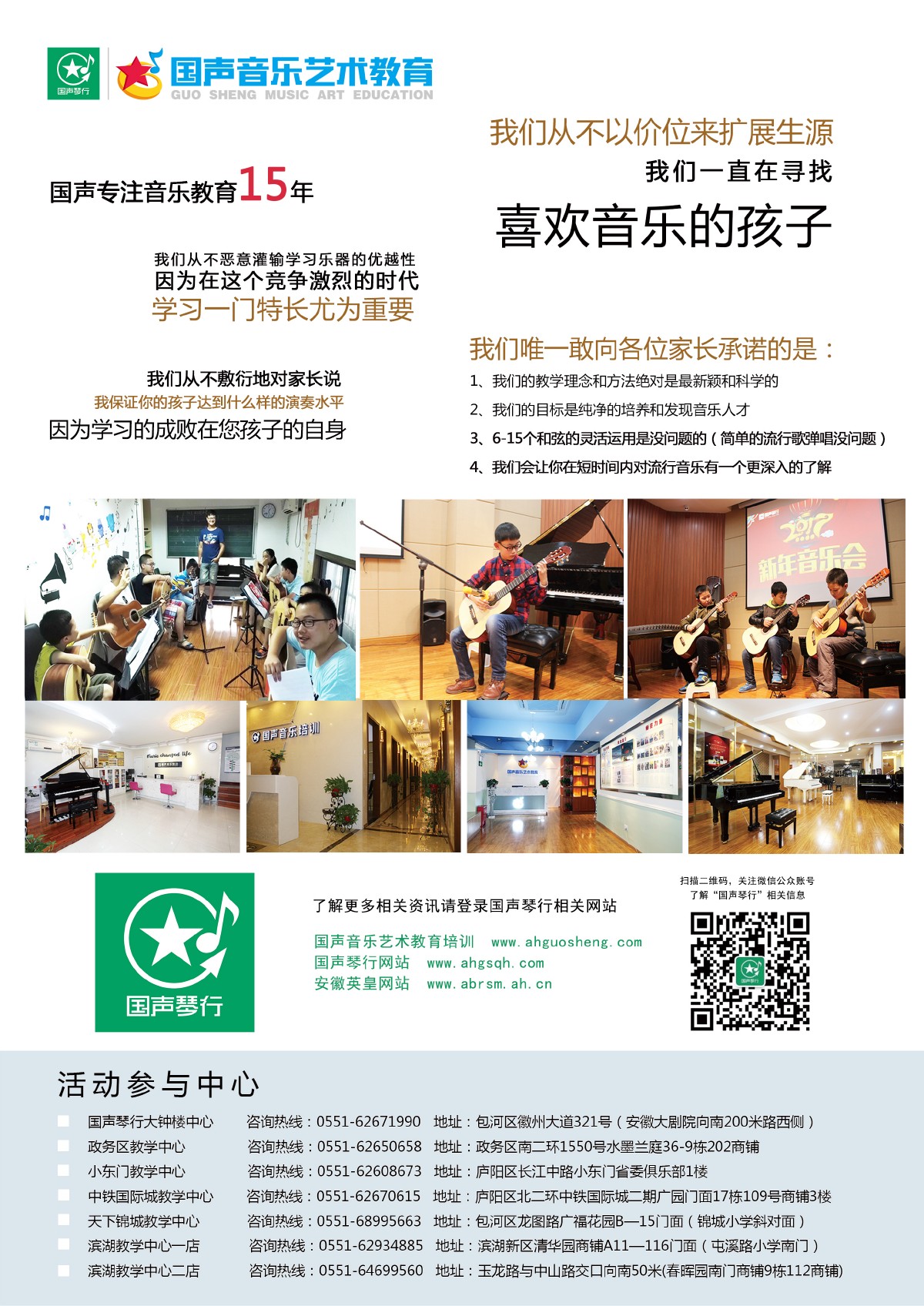 国声音乐艺术教育是安徽省国声琴行有限公司旗下一所音乐教育机构,在安徽省内拥有数十家教育连锁机构,是目前设施最完善、体系最健全的高端音乐培训中心,中心分别设有各种专业的教研研发小组和教研基地,拥有大批音乐学院和重点高校的专职任教老师和教研团队,每位教师都具有一定的教龄和丰富的教学经验。