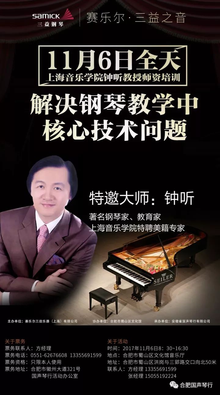 中国首位海归任教的钢琴家、上海音乐学院特聘美籍专家、福建省艺术教育协会钢琴委员会主任;2017年11月6日,合肥市蜀山区文化馆音乐厅,钟听教授的《钢琴教学技术中的核心观念》师资培训讲座。